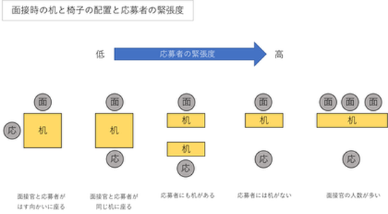 特に面接時の机と椅子の配置や面接官の人数は、応募者の緊張感に大きく影響します。